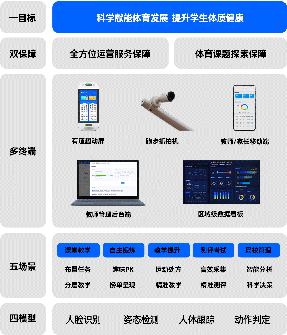 采用“云-边-端”网络架构,通过摄像头、一体化运动屏等智能终端,实时、多排度的采集学生运动数据。基于摄像头+A|运动视觉系统以及一体化交互终端,无需二次调试,无需佩戴设备,即可实现无感、智能化的锻炼、教学、评价一体化,覆盖引体向上、立定跳远、仰卧起坐、实心球、跳绳、中长跑等多项体育运动场景。